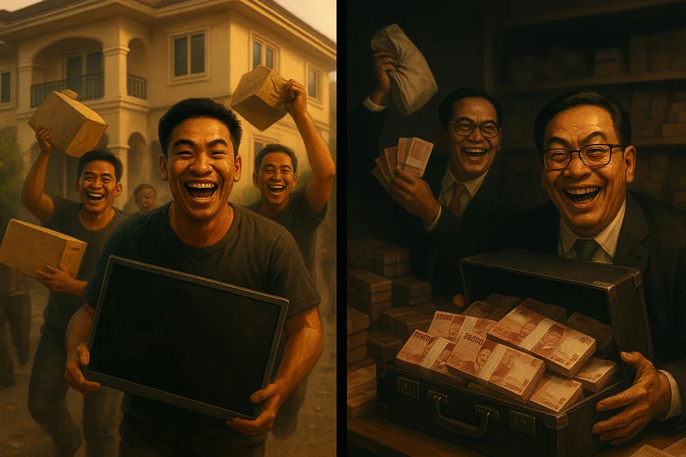 Tetapi, apakah wajah yang berlari sambil membawa televisi atau sepeda listrik dari rumah yang dijarah sungguh berbeda? Atau jangan-jangan, kita hanya sedang bercermin pada versi kecil dari keburukan yang sama?