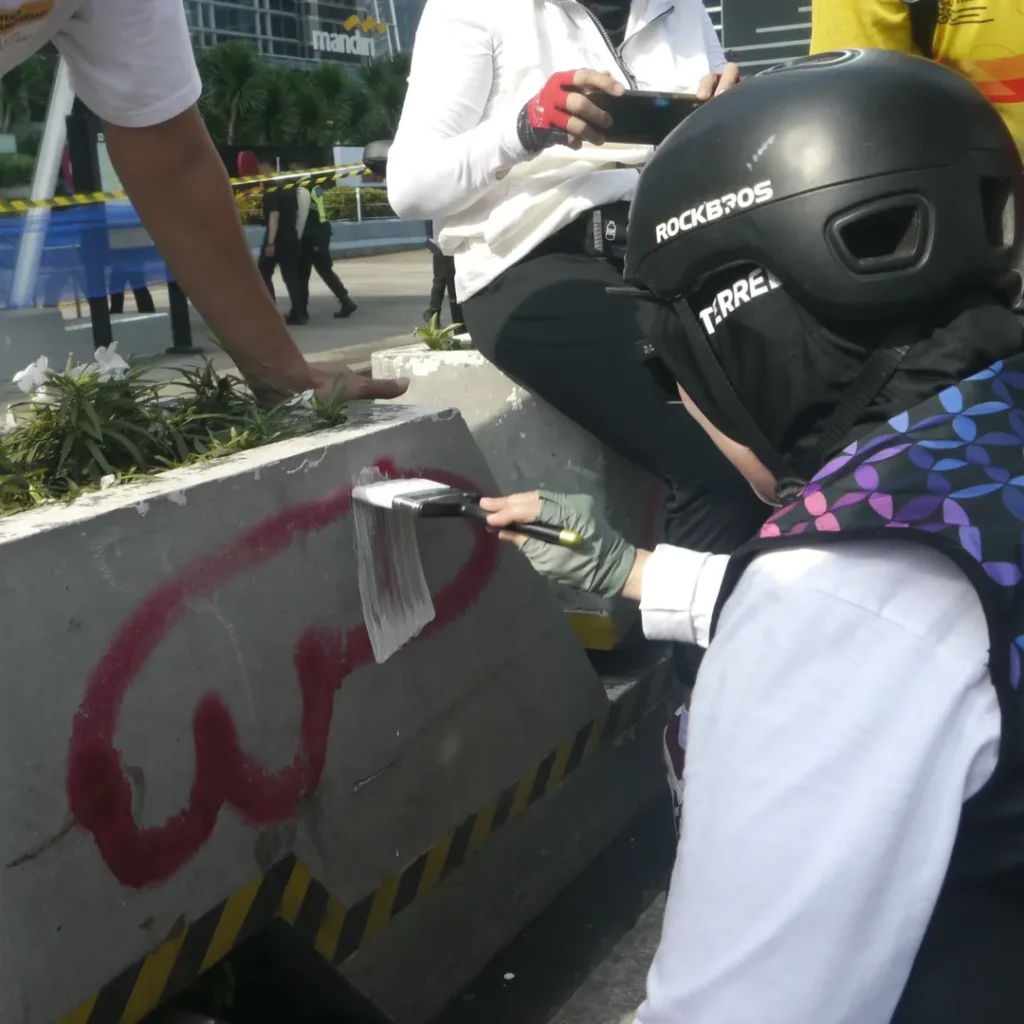 Mereka menutupi coretan di pembatas bukan hanya untuk mengembalikan keindahan, tetapi juga untuk menyampaikan pesan: kota ini milik bersama.